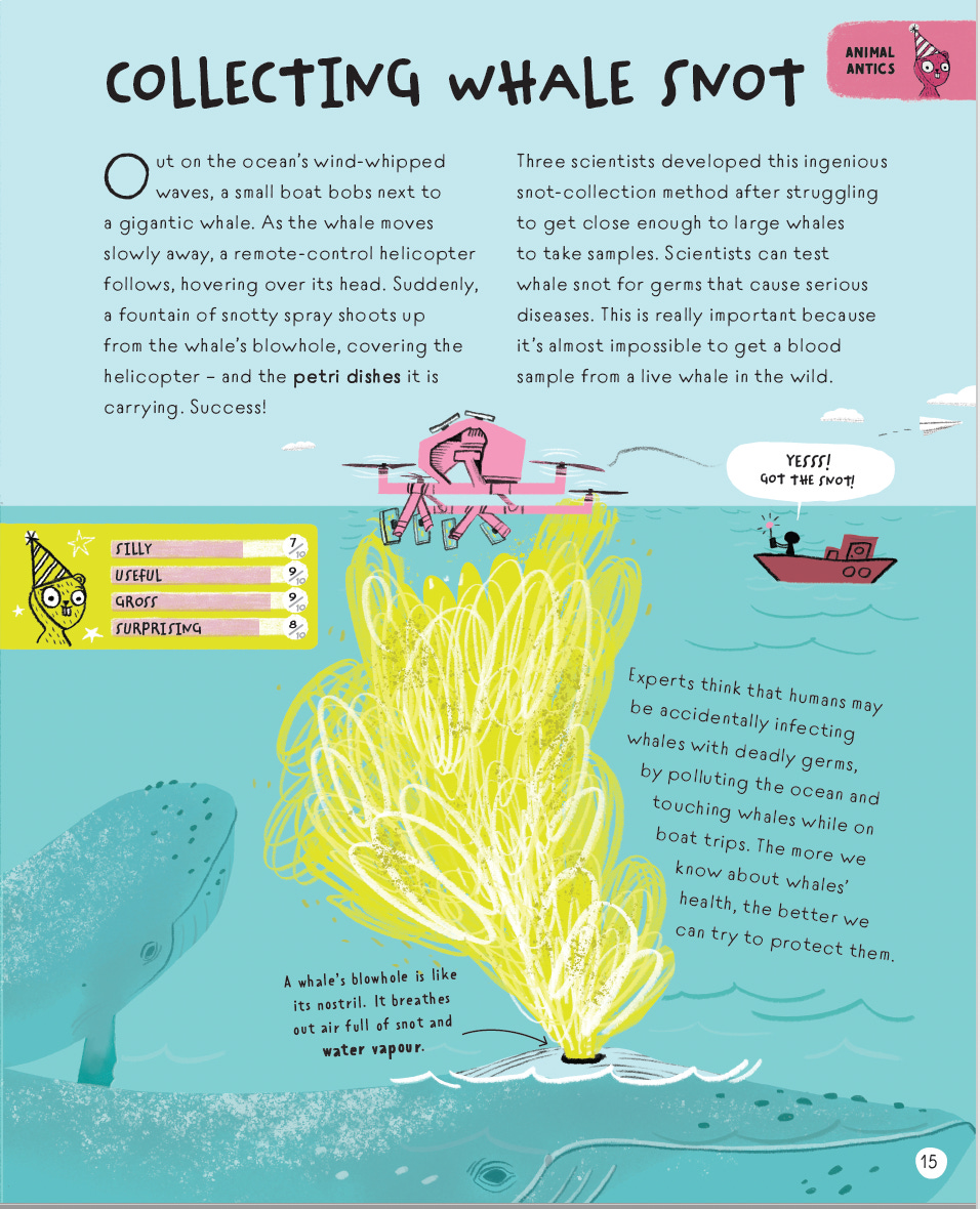 Enjoying reading all the reviews for Farting Fish, my very fun new science book all about winners of the Ig Nobel Prize, with hilarious illustrations by Sam Wedelich. Lots of the reviewers’ children have picked my top pages as their own favourites – including this one about using remote-control helicopters to collect whale snot!